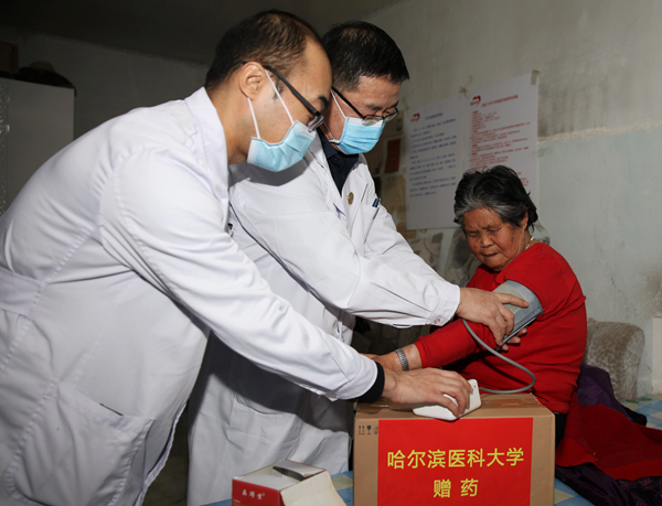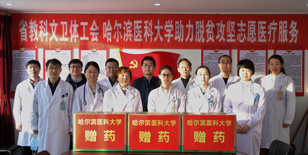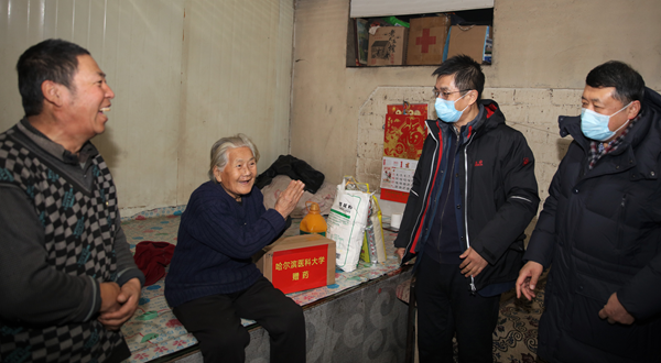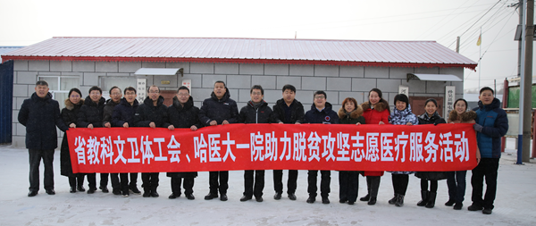 12月24日早7时,在哈尔滨医科大学党委副书记、工会主席贺景平的带领下,哈医大一院党委副书记、工会主席迟秋君组织工会、医疗部门选派由全科医学、心血管内科、神经内科、内分泌科、普外科、骨科、中西医结合科、感染监控科等16名医务人员组成的哈医大一院助力脱贫攻坚志愿医疗服务队,同省总工会副主席王东明,省总工会党组成员、省教科文卫体工会主席吕光英等一行,冒着数九风雪,驱车8个多小时,将黑河市孙吴县腰屯乡河南村、孙吴镇新兴村村民们急需的2万余元药物和医疗技术,送到他们的家中,实实在在为这些脱贫家庭解决治疗难题。
