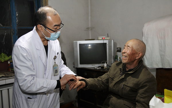 80岁的孙桂芝患有脑梗、心梗等疾病,专家仔细为她检查,与老人的儿子儿媳交流,查看相关病理诊断报告,并为老人送上药品,嘱咐老人和家属吃药注意事项。孙桂芝双手合十,一个劲地感谢医生。