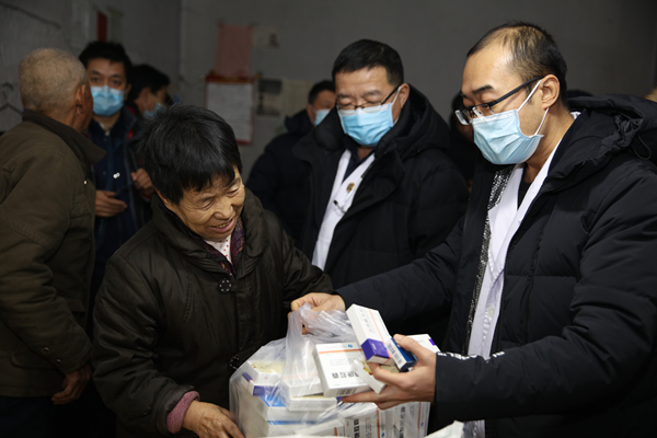同是河南村的袁学美老奶奶今年76岁,当她的女儿看到贺景平递过的药物正是老母亲急需的治疗高血压和心脏疾病药物时,激动地说:“这两天下大雪,老妈的药快吃完了,出去买又不方便,她这高血压又不能断药,幸亏你们送药来啦!”