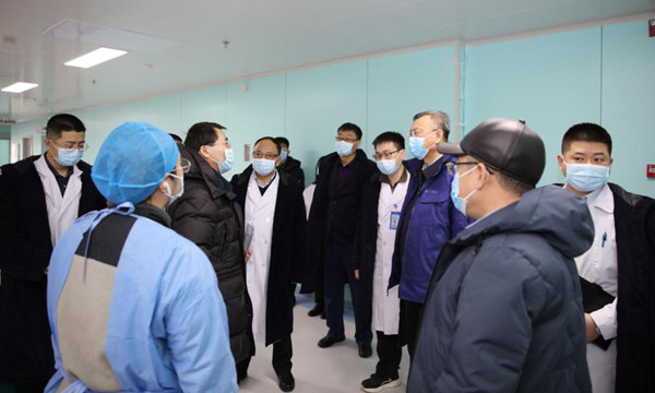 张斌、张学一行首先深入群力院区,实地督导调研黑龙江省平战结合重症救治中心工作,详细了解重症监护病房、缓冲病房、三区两通道、正负压手术室、P2+实验室的运行情况,及新冠肺炎患者救治工作应急能力和各项防护措施。