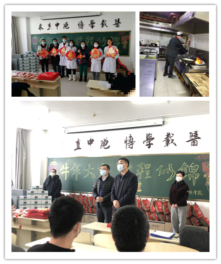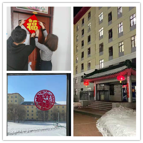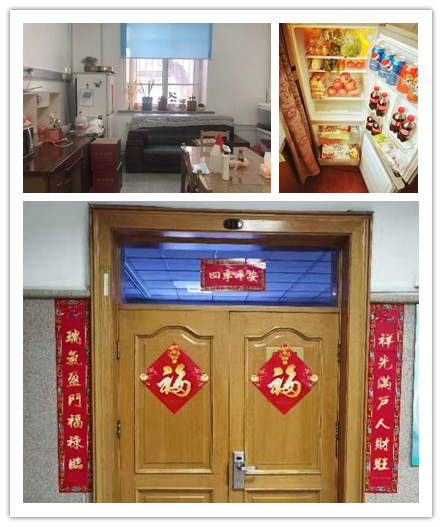 基础医学院为解决春节期间学生购买物资和饮食不便利的问题,保障学生在春节假期中的物资需求,各教研室都为学生准备了饮料、水果、消毒液等生活、防疫物资。每逢佳节倍思亲,为了不让留校学生们在春节期间感到失落,教研室在实验室门上张贴福字和对联,让留校学生在寒冷的北国,也能感受到喜庆年味与温暖关怀,让学生即使不在家乡,没有亲人的见面问候,也能过一个不同寻常且不孤单的春节。
