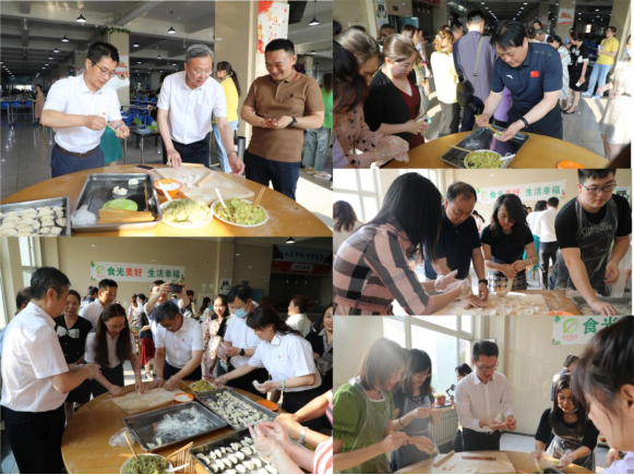 学生食堂二楼餐厅坐满了笑容盈盈的师生们,浇汁鲤鱼、蒜香排骨、香酥虾、杭椒牛柳……芳香飘逸、色味俱佳。学校还特别为远在异国他乡的留学生和回族同学准备了符合其国家和民族饮食习惯的菜品和水饺。在茶歇区,还有各种各样的甜品、水果、解暑绿豆汤和各种饮料......