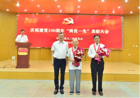 表彰大会在庄严的国歌声中拉开序幕。建党百年的光辉历程,离不开老一辈先辈们的英勇奋斗,党和人民永远不会忘记他们的功勋。哈医大二院共有69名老党员荣获“光荣在党50年”纪念章,作为哈尔滨医科大学和哈医大二院发展的亲历者,他们将自己的全部青春和智慧都奉献给了医学事业。张斌为王志成、康志海两位老党员代表颁发纪念章并献上鲜花,感谢前辈们为哈医大的发展做出的贡献,对他们致以诚挚祝福和崇高敬意。