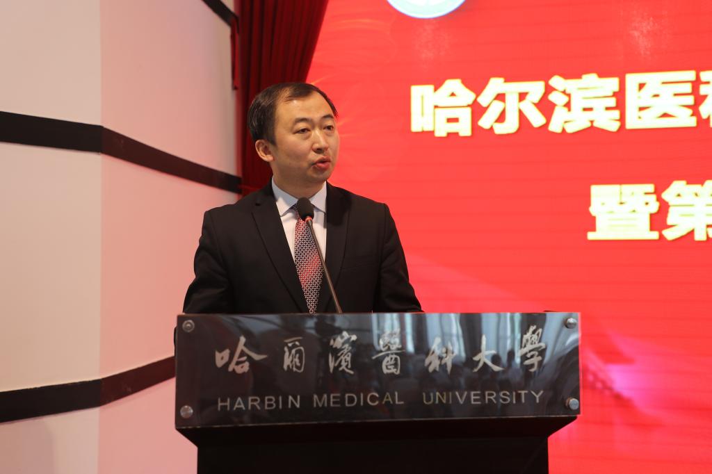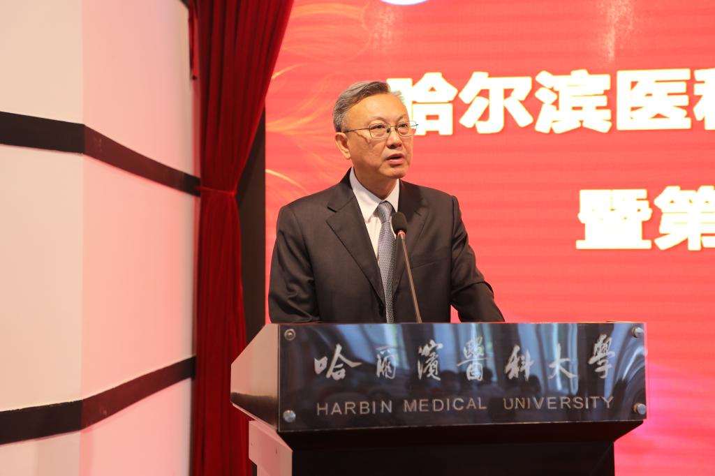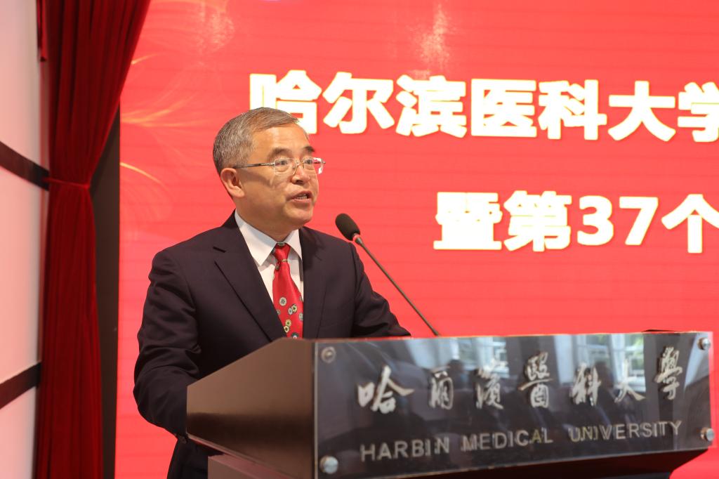 校长张学做题为“赓续两大血脉 共圆百年梦想”的致辞。他首先代表学校,向全校师生员工、海内外校友致以最美好的祝福和最诚挚的问候。他回顾了学校95年发展历程中的两大血脉,指出95年来,学校始终秉持爱国为民的情怀、百折不挠的信念、铸魂育人的宗旨、勇于创新的精神和追求卓越的品质,无数哈医人继承伍连德博士的赤子之心,胸怀红色军医的家国之志,前赴后继、奋勇前行,突破了一个又一个哈医纪录,创造了一个又一个哈医神话。