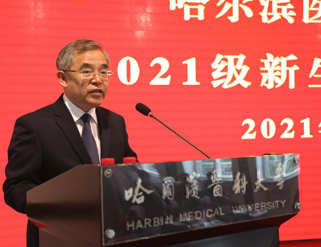 张学校长以《扬志气、强骨气、提底气谱写百年医学强校的青春华章》为题致辞。他代表学校领导班子和全体师生,热烈欢迎新同学的到来。他为同学们打了一针强心剂:哈医大是一所历史悠久的大学,你们一定不会失望。