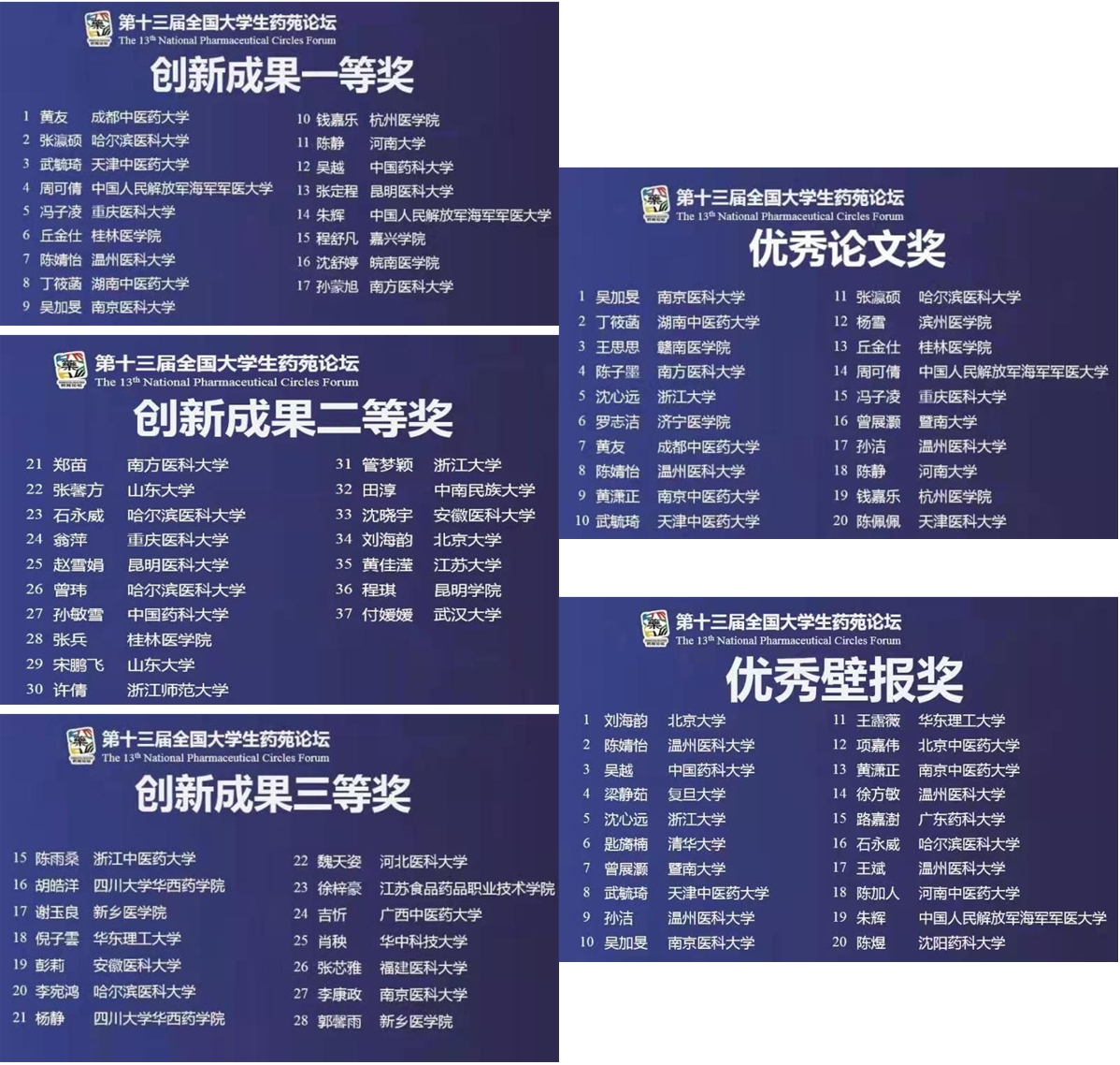 11月11日,第十三届全国大学生“药苑论坛”在温州医科大学茶山校区召开。“药苑论坛”是全国高等教育药学类顶级赛事,此次论坛共吸引清华大学、北京大学、浙江大学、中山大学、上海交通大学、中国药科大学、沈阳药科大学、哈尔滨医科大学等110余所院校的近600名师生以线上线下相结合的方式参加。我校药学院四个代表队参加本届论坛,共获得一项创新成果一等奖,两项创新成果二等奖,一项创新成果三等奖,一项优秀壁报奖和一项优秀论文奖。