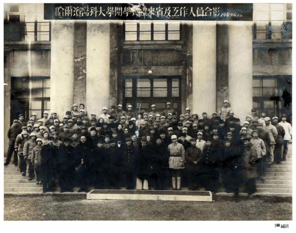 1949年4月16日,会师哈尔滨的一、二分校在新校区中央图书馆前(接收的文庙大成殿)正式宣告顺利合并,举行哈尔滨医科大学开学盛典,开始建校(从此,1949年4月16日成为哈尔滨医科大学校庆纪念日)。我们龙井分校三大队学员,分别编为哈尔滨医科大学内科、外科、五官科专业三个学生队。于是我成为哈尔滨医科大学内科专科首批学员。此时的学校仍属军事院校,学员有军藉,供给制,着军装。