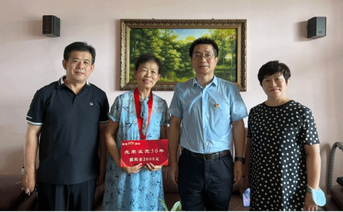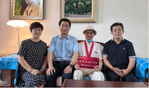 五十载红色初心,五十载信仰弥坚。为庆祝中国共产党成立101周年,传承党的初心和使命,提升老党员荣誉感、归属感,近日,我校党委副书记兼工会主席贺景平、离退休工作处处长兼离退休党总支书记王玮、离退休工作处副处长王冬梅一行到满50年党龄的老党员家中颁发“光荣在党50年”纪念章,并送去了慰问金。
