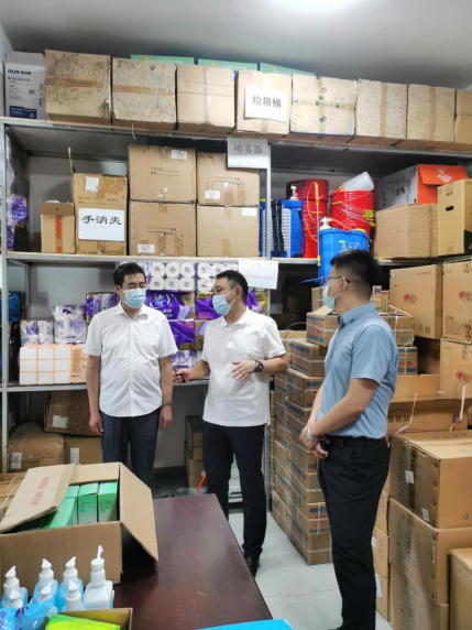 在防疫物资储备库,指导组认真检查了防疫物资的种类、效期和数量等情况,充分肯定了学校防疫物资准备工作,并要求学校在遇到紧急突发情况时,要确保防疫物资及时足量供应。