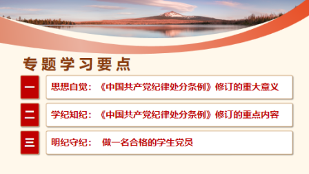 王罕哲围绕《中国共产党纪律处分条例》的发展及历次修订背景、新修订《条例》的重要意义以及准确理解和把握《条例》的内涵要义和实践要求,对新修订的《条例》进行了全面深入系统的解读,详细阐述了一名合格的学生党员,要把学习成果运用到提高自身政治能力上、对主观世界改造上,同时要树牢底线思维。专题讲座条理清晰、层次分明、逻辑突出,既重点解读了《条例》修订的主要内容,也系统分析了《条例》的逻辑架构;既有概念讲解,又有内涵分析;既有问题列举,又有相关法则释义,为全体学生党员上了一堂深刻的党纪学习教育课。