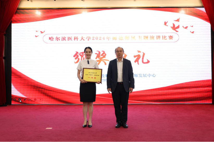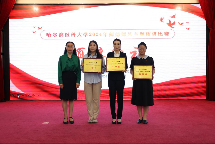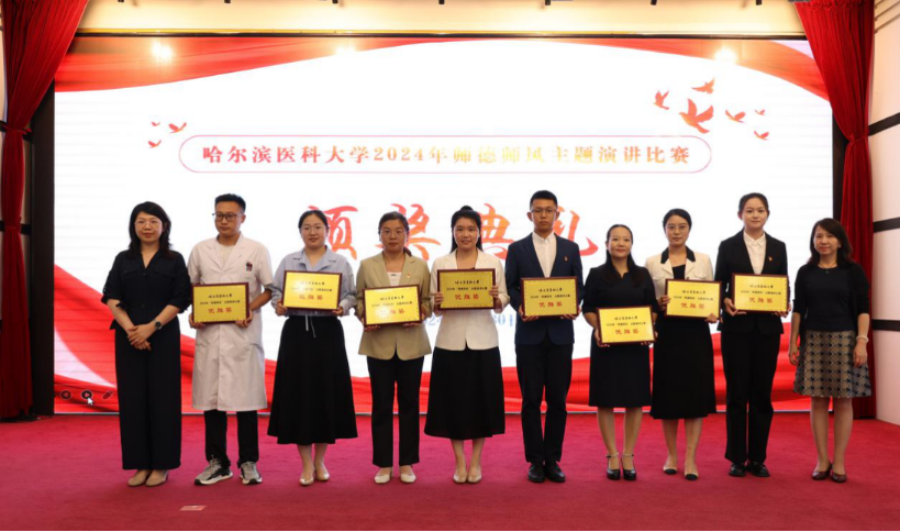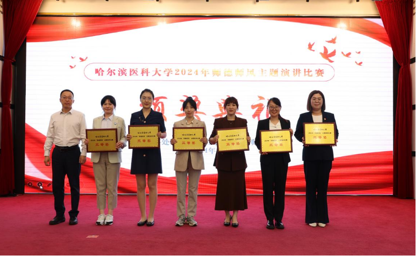 各位参赛选手以真挚充沛的情感和各具魅力的语言,深情讲述了校园内一个个感人至深的师德故事,充分展现了良好的精神风貌和职业风采,深刻诠释了哈医教育人的真挚情怀与执着坚守。最终,护理学院(附属一院)的左博文荣获一等奖,附属二院的朱莎、附属一院韩爽、附属一院徐倩荣获二等奖,马克思主义学院孙宇航、附属肿瘤医院胡馨元、附属肿瘤医院张艳洪、基础医学院郭铁云、卫生管理学院严丹、基础医学院高春阳荣获三等奖。其他8名选手获得优胜奖。