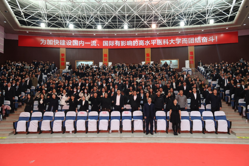 本次会议采取线上线下相结合的方式进行,主会场设在学校主楼科技会馆,分会场设在第一、三、四临床医学院、大庆校区和附属五院。全校共计600余名新教师参加会议。