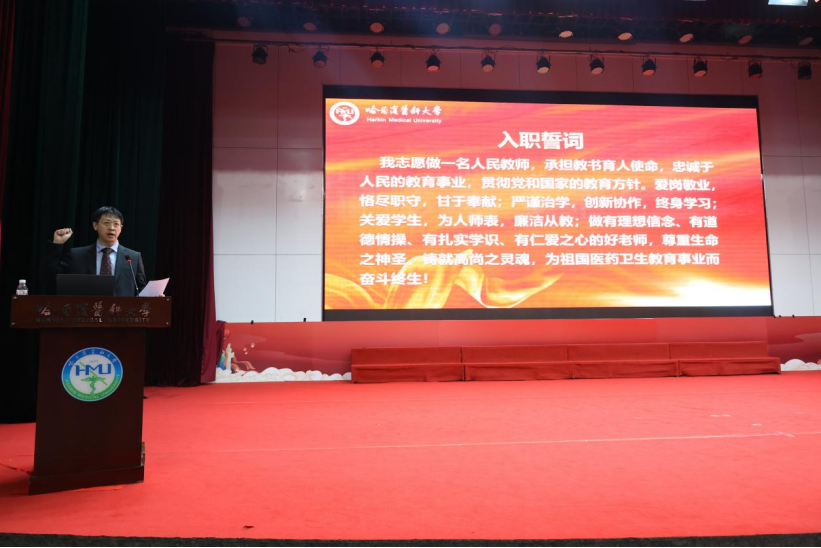 在新教师入职宣誓仪式上,由学校入选国家级青年人才项目、博士生导师、公共卫生学院副院长田懋一教授作为领誓人,带领全体新教师进行入职教师宣誓,增强新教师对教师职业的荣誉感、责任感和使命感。