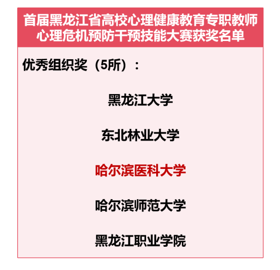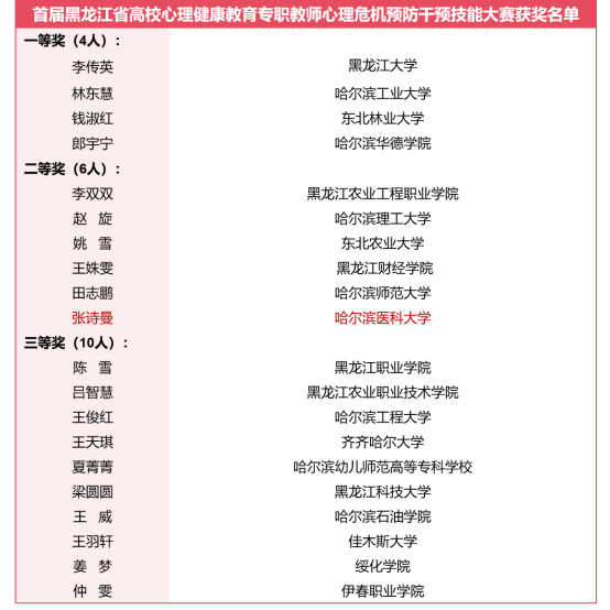 12月11日至13日,黑龙江省教育厅主办的首届黑龙江省高校心理健康教育专职教师心理危机预防干预技能大赛在黑龙江大学举办,我校大学生心理健康教育中心张诗曼老师代表学校参赛荣获二等奖,学校获得优秀组织奖。全省60余名高校心理健康教育专职教师参赛,78所高校心理健康教育专职教师代表观摩大赛。