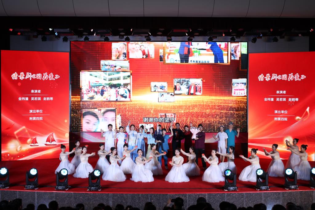 附属四院的情景剧《因为爱》和附属三院的歌舞《点亮生命的光》生动诠释了我校附属医院医疗工作者们甘于奉献的医者情怀和大爱无疆的医者担当。