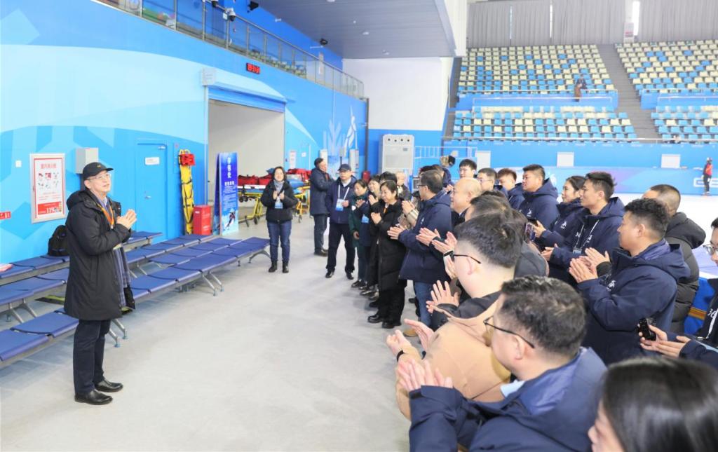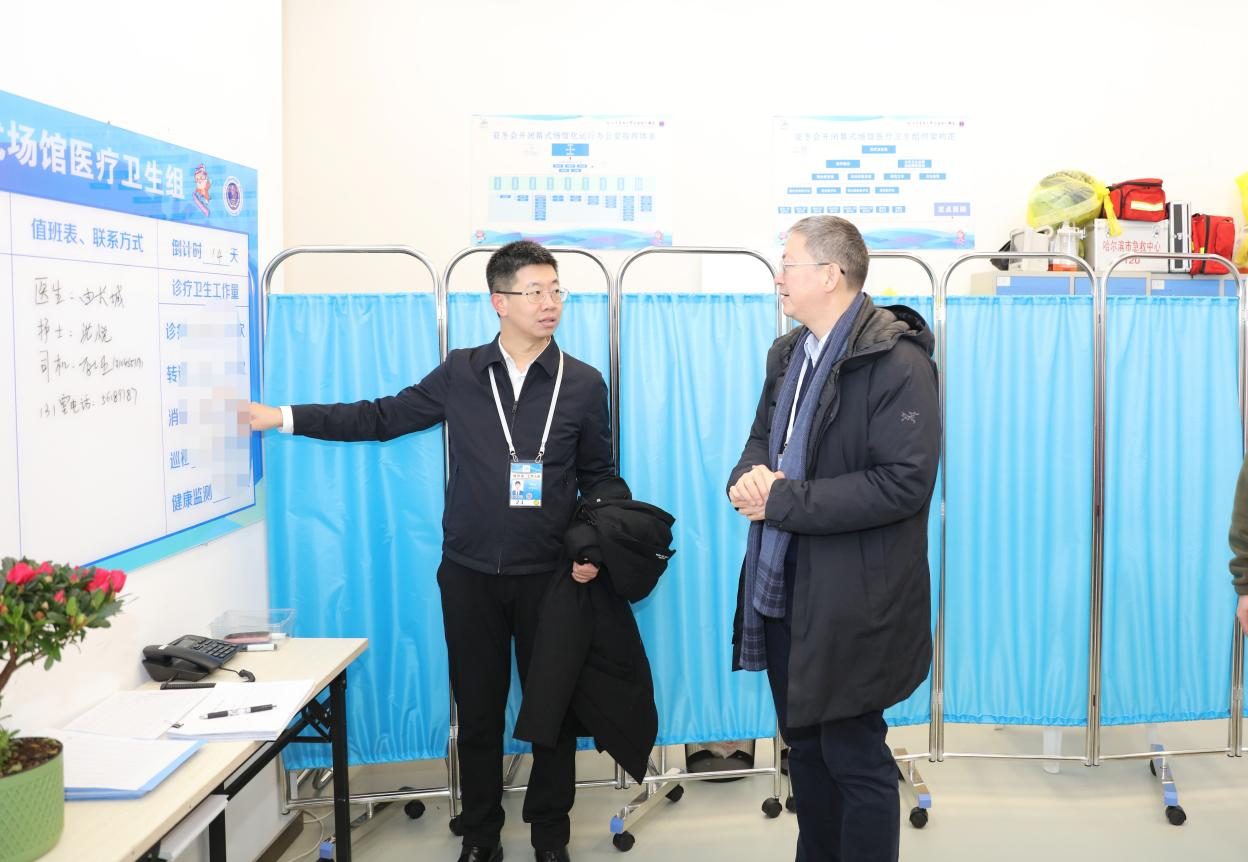 孙备院长先后来到冰球馆、综合馆、速滑馆、冰壶馆、开闭幕式场馆和冰上项目运动员村诊所,检查医疗物资、人员配备、药物管理、诊疗流程、患者转运、应急演练等工作。孙备院长指出,大家要强化大局意识、担当意识,坚持以运动员为中心,服务赛事需要,选配思想好、技术好、态度好、外语好、形象好的“五好”医生,持续提升应急反应速度和综合救治能力,为亚冬会的成功举办提供医疗保障。