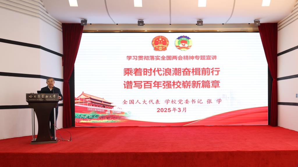 3月19日上午,学校举办习近平总书记重要讲话和全国两会精神宣讲会暨2025年度开学第一堂思政课。十四届全国人大代表、学校党委书记张学院士向全校师生宣讲传达习近平总书记在全国两会期间的重要讲话和全国两会精神。本次宣讲是一次意义重大的党课,是2025年度开学第一堂思政课,也是校院党委联学的理论学习中心组扩大学习会。学校党委副书记东梅主持会议。