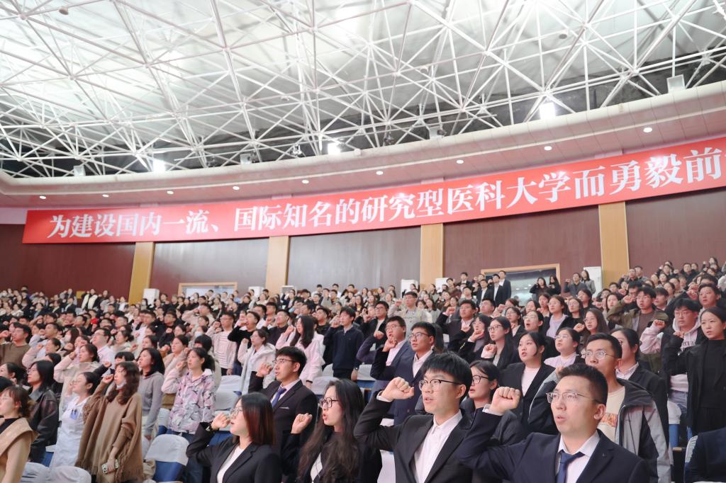报告结束后,举行了庄严的新教师入职宣誓仪式。在领誓人潘振伟教授的带领下,全体新教师肃立,举起右拳,许下了投身教育、奉献哈医的坚定誓言。