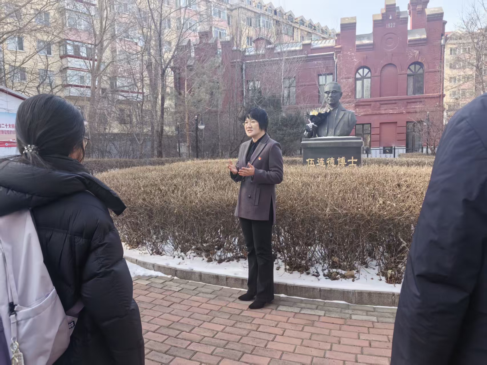 师生代表向伍连德博士铜像敬献鲜花,马克思主义学院孙翠翠老师现场讲解伍连德博士的光辉事迹和伟大精神。随后,师生参观伍连德纪念馆,了解伍连德博士波澜壮阔的一生,对“赤诚爱国 自强创业”的精神有了更深刻的认识。在纪念馆展厅,师生们在“科学防治”“药物调配”等展区驻足凝望。1910年东北鼠疫中,先生勇挑重担、病理解剖求真、创造性研制“伍氏口罩”;资源匮乏年代,他凭借扎实学识攻坚克难,一件件实物、一段段史实,让在场师生产生强烈的时空共鸣。