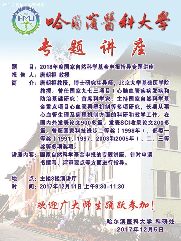 讲座内容:国家自然科学基金申报的专题讲座,针对申请书撰写、评审要点等方面进行指导。
