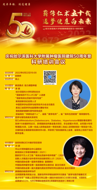 为迎接哈尔滨医科大学附属肿瘤医院建院五十周年,见证医院五十年来的发展历程,充分展示医院五十年来发展的卓越成就,展现医院五十年的光辉历程,医院将于2022年6月22日19点举办“科技创新·驱动发展”哈医大肿瘤医院50周年院庆系列学术活动之科研培训会议,欢迎各位同仁积极参与!