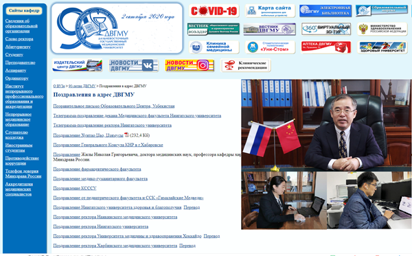 10月2日至13日,远东国立医科大学90周年校庆暨中俄国际医学会议以线上和线下的方式举行。校长张学院士受邀参会并在开幕式上致辞。他表示,俄罗斯远东国立医科大学在90年里,其科学研究、医学教育、医疗方面的成就在俄罗斯联邦中发挥着非常重要的作用,并在国际上享有很高声誉。两校兄弟般的友谊始于2006年,在过去的14年中,成功举办了很多学术论坛,为中俄医学研究人员之间的交流与合作搭建了桥梁。衷心希望两所大学之间的科学交流领域将继续扩大,祝俄罗斯远东国立医科大学成立90周年校庆活动圆满成功。