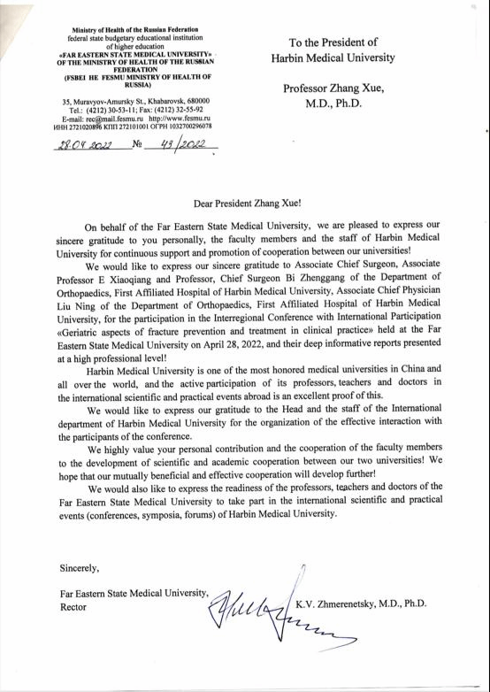 远东国立医科大学校长Zhmerenetsky 教授对张学校长及我校师生对此次会议及一直以来两校国际合作的支持表示衷心的感谢。Zhmerenetsky特意给张学发来感谢信,信中表示哈尔滨医科大学是他们最尊重的医科大学之一,其高水平的科学研究和医生教师团队在俄罗斯获得了高度认可。Zhmerenetsky希望两校之间的合作能在张学带领下继续发展扩大,取得更加丰硕的成果。