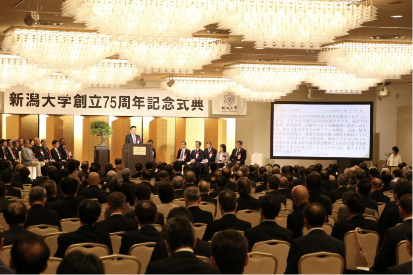 校庆仪式上,季勇校长作为新潟大学3名国际合作院校代表之一,第一个上台发言。他对新潟大学办校75年来取得的丰硕成果表示祝贺,希望两校站在新的历史起点,进一步深化两校的合作交流,推动两校教育事业高质量发展。他强调,2026年,哈尔滨医科大学即将迎来百年校庆,欢迎日本高校各界人士来我校访问、交流、合作。