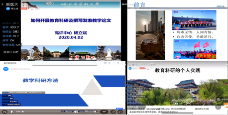 高评中心主任杨立斌教授作了题为《如何开展教育科研及撰写发表教学论文》的报告,涵盖教育科研课题的类型、教育科研课题的选题及申请书撰写、教育科研的流程、教学成果的总结、教学论文的撰写与发表等方面内容。他鼓励教师热爱并投入教育研究、加强研究与实践的结合、注重平时积累与研究成果的推广。卫生管理学院焦明丽教授作了题为《教育科研方法》的报告,内容涵盖教学研究方法论体系、教育科研课题确定的原则与选题策略、题目的拟定、研究方法的选择等,并结合当前疫情期间的有关文献进行了案例分析。基础医学院商庆龙教授作了题为《教育科研的个人实践》的报告,根据自己教育科研实践的经历,介绍了教育科研的过程、教学研究体系的建立、教育研究问题的确定、研究方案的建立与实施、学术规范与伦理、研究成果的总结与发表,并结合自己参与的医学创新教育、实验教学体系等教育科研课题进行了案例分析。