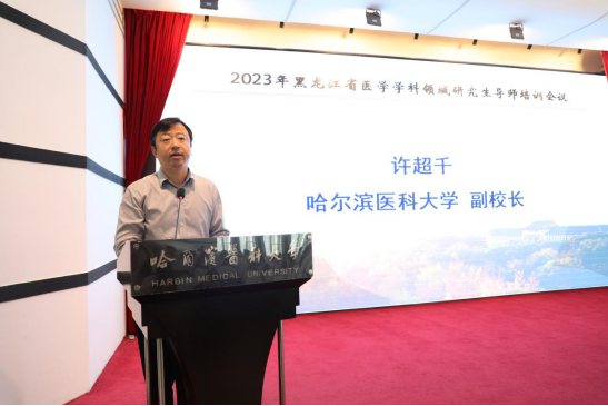 许超千在致辞中代表学校感谢黑龙江省学位委员会、黑龙江省教育厅及兄弟院校对我校学位与研究生教育工作的大力支持和帮助,对全省医学学科领域研究生导师参加本次培训表示欢迎。许超千指出,研究生教育是国民教育的重要组成部分,在培养高层次创新人才方面具有既直接又基础的重要意义。导师是研究生培养的第一责任人,是全面提升研究生培养质量的关键环节,造就一流的导师队伍是研究生教育改革发展的根本要求。哈尔滨医科大学将进一步加强导师队伍建设,为研究生导师提供成长环境和发展平台,充分激发研究生导师育人育才的积极性。许超千表示,希望通过导师培训使广大研究生导师掌握新时代研究生成长和人才培养的新要求,不断提高研究生导师的综合素质和指导能力,切实提高培养研究生的本领,为我省医学学科领域培养更多高水平人才。