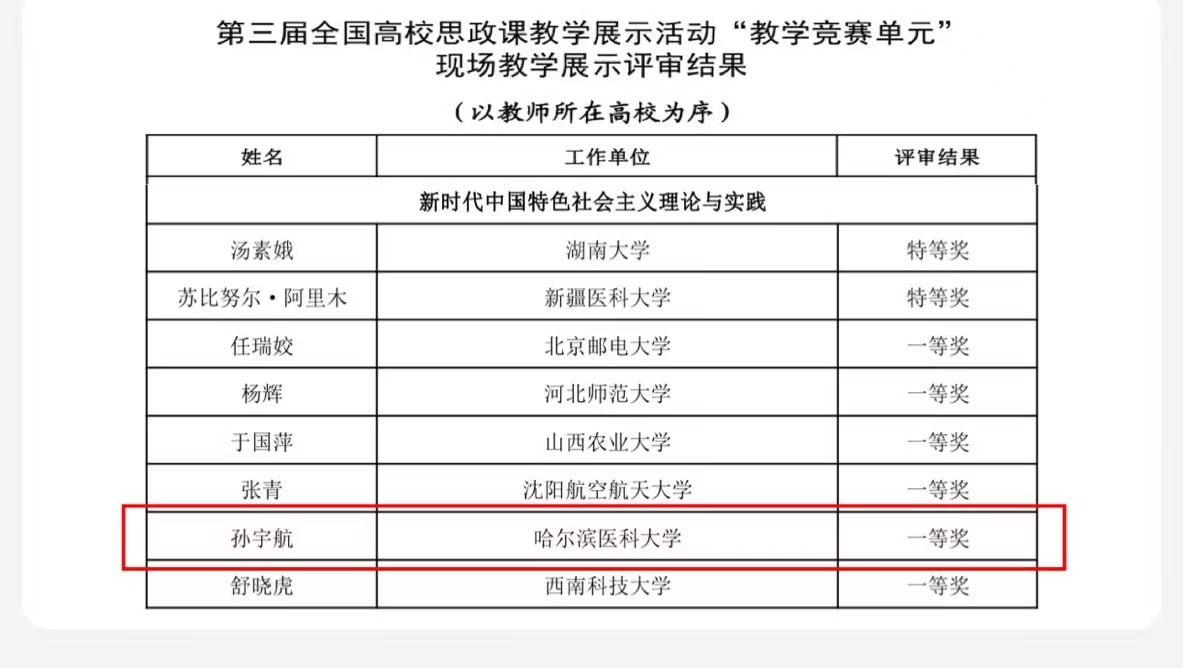 近日,在教育部举办第三届全国高校思想政治理论课教学展示活动中,我校马克思主义学院孙宇航老师获得研究生思政课《新时代中国特色社会主义理论与实践》组一等奖。这项活动是全国高校思想政治理论课教学比赛主办规格最高、参赛面最广、参赛选手水平最强的活动,比赛包含省内选拔、全国复赛、决赛三个阶段,经过5个月的层层选拔和激烈角逐,来自全国的298名教师进入决赛。