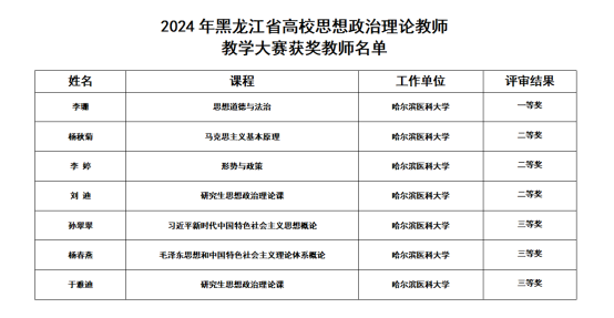 11月2日至3日,由黑龙江省教育厅与省教科文卫体工会联合举办的2024年全省高校思想政治理论课教师教学大赛决赛在哈尔滨师范大学圆满落幕。我校马克思主义学院教师荣获一等奖1项、二等奖3项、三等奖3项,哈尔滨医科大学荣获优秀组织奖。本次教学大赛于2024年8月开展,全省78所大中专院校300余名思政课教师报名参赛。