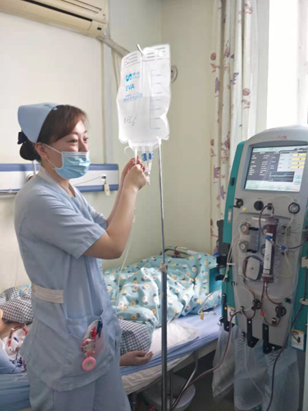 哈医大一院肾内科透析护士关欣为患者行床头血液净化治疗