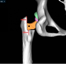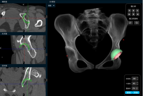 小张入院后,立即开始逐步进行相关检查,进行术前的准备。因为DDH的手术一般比较复杂,特别是这种脱位程度较高的患者,所以术前就需要更加精准的规划。对于小张的手术方法,耿硕制定了两套方案:一是如果原来真臼内及股骨头的软骨条件良好并且相匹配的话,那么可以尝试将股骨头放进髋臼里配合骨盆截骨重建髋关节;二是如果软骨条件不好或难以匹配,那么只能行全髋关节置换术。但是所有手术方案都会有一个挑战,就是如果在安装完髋臼杯及股骨假体后复位时把股骨下拉过多,可能会造成神经等软组织的牵拉伤并且因软组织张力过大可能造成假体松动,为了避免这种情况可能需要行股骨截骨减张,这样一期便不能恢复双下肢等长,需二期行骨延长术恢复下肢等长。在术前,为了适应软组织的张力状态及验证复位可能性,小张入院后即进行了患肢的牵引处置。为了精准的对手术做出规划,术前小张进行了下肢全长的三维CT扫描和模型重建,并且应用人工智能系统AI HIP对其进行术前手术方案的制定。人工智能能够利用患者的三维CT数据进行智能化识别解剖位点,匹配假体的大小及安放位置,通过对手术精准地预演,让外科医生在术前心中有数。通过人工智能系统的规划,计算出小张同学的双下肢腿长差和偏距差,计算出了旋转中心所需下移的距离和假体需要安放的位置等,髋关节置换方案为S-ROM假体系统,髋臼杯为PINNACLE 44号,内衬为BIOLOX28-44,因为患者比较年轻,所以选用了陶瓷对陶瓷的摩擦界面,能够实现更长的使用年限。根据术前规划数据,毕郑刚、耿硕团队提前准备了相应的假体和器械,为手术做了充分的准备。