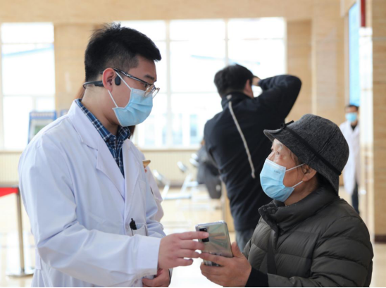 门诊部工作人员耐心帮助不会使用智能机的老年人预约挂号
