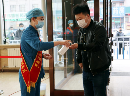 志愿者为每一名进入门诊大厅的患者进行手消毒