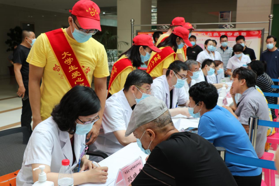 7月29日下午14时,医疗队抵达明水县双兴镇东双村。在义诊现场,前来咨询问诊的村民络绎不绝,在哈医大一院学生志愿者的引导下,义诊活动有序进行,医疗队耐心细致地为每一位村民进行听诊、血压测量、病史分析、健康指导及送药等健康服务。