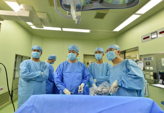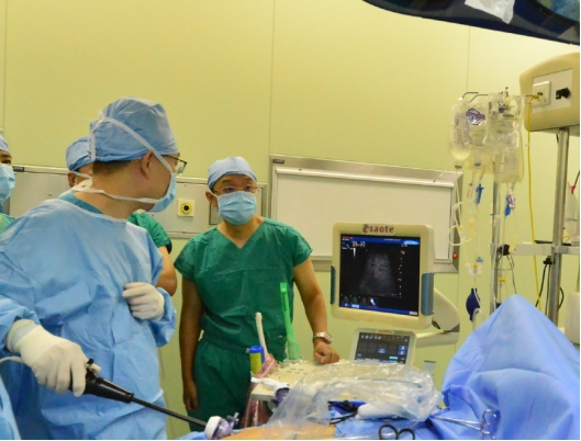 陈晓宁副主任医师操作特质超声探头,直接在腹腔镜下顺利进入腹腔,更加直观和准确定位肿瘤位置