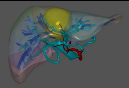 术前对肝脏情况进行三维重建,黄色为肿瘤