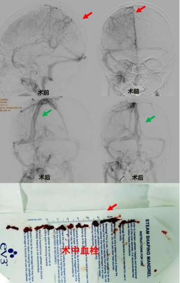 神经外科导管室早已做好各项准备。史怀璋团队、护理团队联合麻醉团队为患者成功进行了颅内静脉窦取栓,造影显示上矢状窦完全闭塞,栓子复合量非常大,通过支架机械取栓配合大管径导管的不断抽吸。终于将静脉窦打通,同时配合药物治疗放置静脉窦再次溶栓,维持静脉窦开放通畅。术后,患者恢复良好,第三日脑血管造影的检查静脉窦完全通畅,第四日恢复正常。