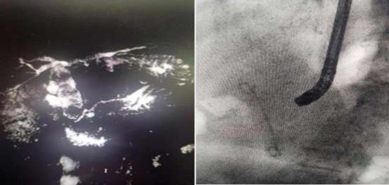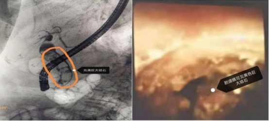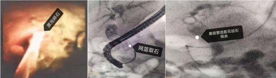 手术当日由史立军、李雯和于琪在消化内镜中心开展,术中可见原有胆管内支架已经梗阻失去引流作用,拔出支架后,选择胆管插管,导丝顺利进入胆管,造影可见胆管内充满巨大结石,最大结石约2.5cm。以扩张球囊将乳头开口扩张至1.0cm,乳头开口无活动性出血,而后插入数字胆道镜,可见胆管内巨大结石,而后经数字胆道镜插入激光光纤进行碎石,巨大结石被逐一击碎,而后用网篮将碎石取净,置入鼻胆管。术后患者无并发症,无创伤,鼻胆管造影无结石残留。