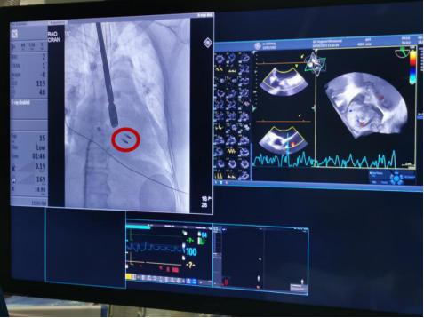 二尖瓣夹合器(红圈处)成功精准植入