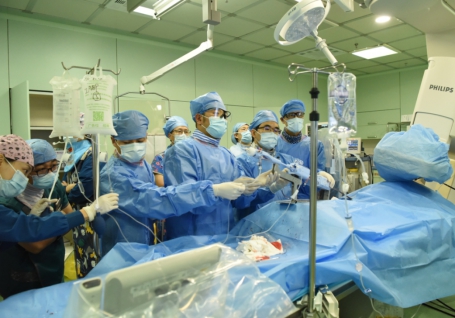 术中,在全麻状态下,介入团队陈涛副主任医师、张东会副主任医师和杨光副主任医师,默契配合,经血管插入一根细长导管,将一个特制的“夹子”二尖瓣夹合器,经股静脉进入、穿过房间隔,进入左心房及左室,在三维经食道超声及DSA引导下,使用二尖瓣夹合器夹住两个瓣叶的中部,缩小二尖瓣中间的缝隙,使二尖瓣在收缩期由大的单孔变成小的双孔,心脏超声即刻复查,显示植入的二尖瓣夹合器位置精准,患者二尖瓣反流面积从术前的13.3平方厘米下降至无反流,用时一个半小时,手术顺利完成。