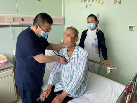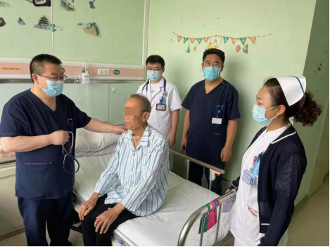 术后,李君权主任(左)和孙桂芝护士长(右)带领团队对王大爷进行查房