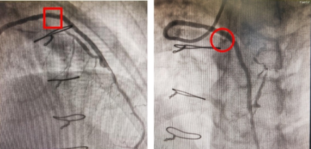 根据造影显示,患者自身冠状动脉两支闭塞,另一支发育较小。四支静脉桥血管病变也十分严重,第1支大隐静脉与LAD行端侧吻合,近端吻合于主动脉(AO),桥血管狭窄95%;第2支大隐静脉远端与右冠远端行端侧吻合,近端吻合于AO,桥血管狭窄95%;第3支大隐静脉近端吻合于AO,远端与对角支行端侧吻合,桥血管通畅;第4支大隐静脉闭塞,病情极其危险。