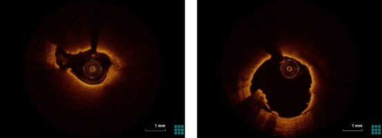 介入团队中刘慧敏副主任医师指出,既往药物球囊主要适用于一些小血管病变、分叉血管病变及支架内再狭窄血管病变的处理且证据较充分,但在SVG再狭窄中应用报道极少。而王女士冠脉搭桥手术术后10年,桥血管出现了新的病变,其粥样硬化斑块多为易碎、富含脂质和血栓的粥样斑块,对这类病变进行介入治疗之前必须要充分评估病变的特点和风险,选择合理的策略,以取得介入治疗的最佳结果。因此,应用光学相干断层成像(OCT)技术来判断静脉桥病变情况,具有非常重要的意义,OCT检查对静脉桥血管直径大小判别具有良好的一致性,也能识别SVG病变的斑块性质,是否存在血栓等,综合判断介入术中发生无复流的可能性大小,有利于术前充分准备预防措施。