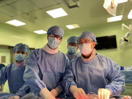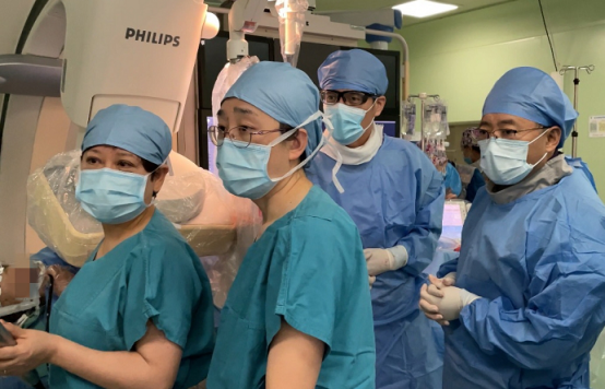 哈医大二院心血管病医院院长、心内科主任于波教授(右1)带领张东会医生(左2)、杨光医生(左1)和陈涛医生(右2)完成东三省首例一站式经导管主动脉瓣膜置换术+二尖瓣球囊成形术