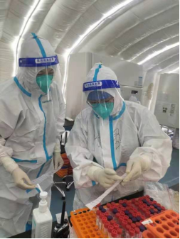 “我对战胜疫情最大的信心是来源于我的队员们。核酸检测工作24小时通宵达旦,三级防护,一个动作重复上千次,埋头苦干,半小时不到,队员们防护服内的衣服都会湿透。轻伤不下火线,有些队员身体不适也依然坚守在岗位。看到他们不畏艰辛、挑灯夜战的身影,让我更加坚定了必胜的信念”,张艳芬说。