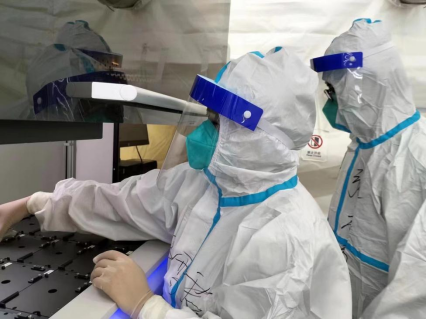 10月31日检验队下午抵达哈尔滨市移动实验室,便立即展开工作,设备组装、开会、培训、技能考核,队员们斗志昂扬,11月1日凌晨两点半才纷纷去休息。张艳芬休息了不到1个小时,早上5点便又来到工作区和队员们完善工作流程、调试机器,早8点检验队就接收到第一批核酸样本。11月1日,40名队员历时22小时,高质量零差错完成8000份样本检测。