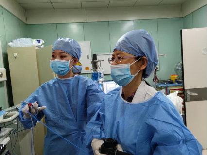 手术当日,疼痛科方先海副主任医师评估患者生命体征,为患者实施气管插管及麻醉,麻醉生效后,曲波通过内镜到达在距患者食管憩室间脊上方3cm处,建立1.5cm大小的纵向切口作为隧道入口,随后,将食管黏膜层和肌层仔细分离,建立纵向黏膜下隧道至憩室底部远端1-2cm处,切开并充分暴露间脊,小心切割憩室间脊内部肌纤维至憩室底部,充分止血后用金属夹封闭黏膜开口,至此,经黏膜下隧道憩室间脊切开术成功,全程仅用时2小时。